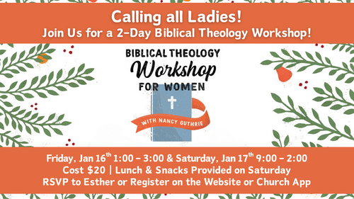 Women! You're invited to join us for our Biblical Theology Workshop for Women with Nancy Guthrie on Friday, January 16th (from 1:00-3:00) and Saturday, the 17th (from 9:00-2:00). Click to learn more and to register.